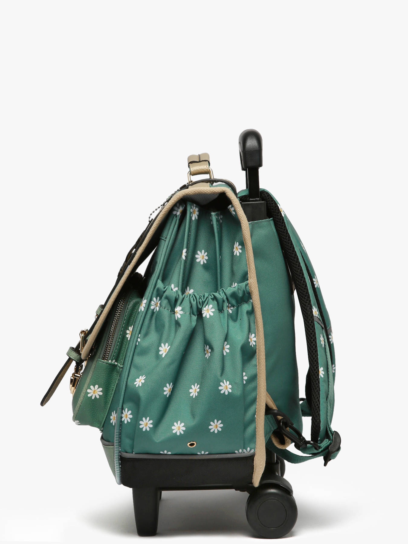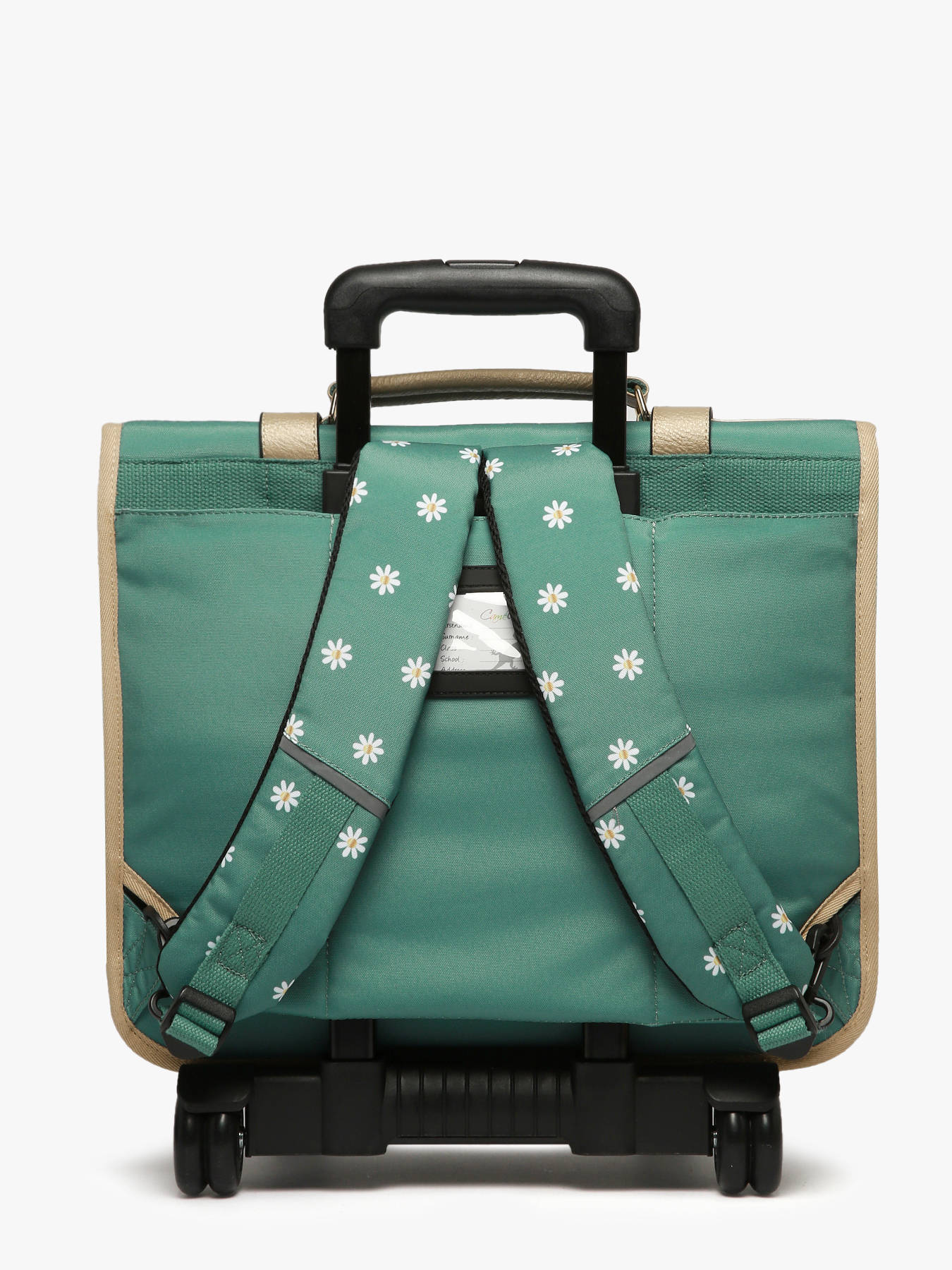 0.9 kg ~ This 41 cm, 3-compartment wheeled school bag from the Vintage Fantasy line by Caméléon is perfect for CM1 and CM2 students. Loved for its large storage capacity, it features three compartments that can hold notebooks and binders up to 32x29x7 cm, along with an interior zipped pocket. On the outside, it includes two front zippered pockets and a side bottle holder. A reflective strip on the front ensures your child’s safety. The bottom and sides are reinforced for daily use. It can also be worn as a backpack thanks to the detachable shoulder straps stored in the back pocket and the padded protection over the wheel frame to protect your child's back. For optimal support, the shoulder straps and back are padded.  As a bonus, this school bag includes a name tag, a free ruler, and a fun chameleon keychain on the handle !
