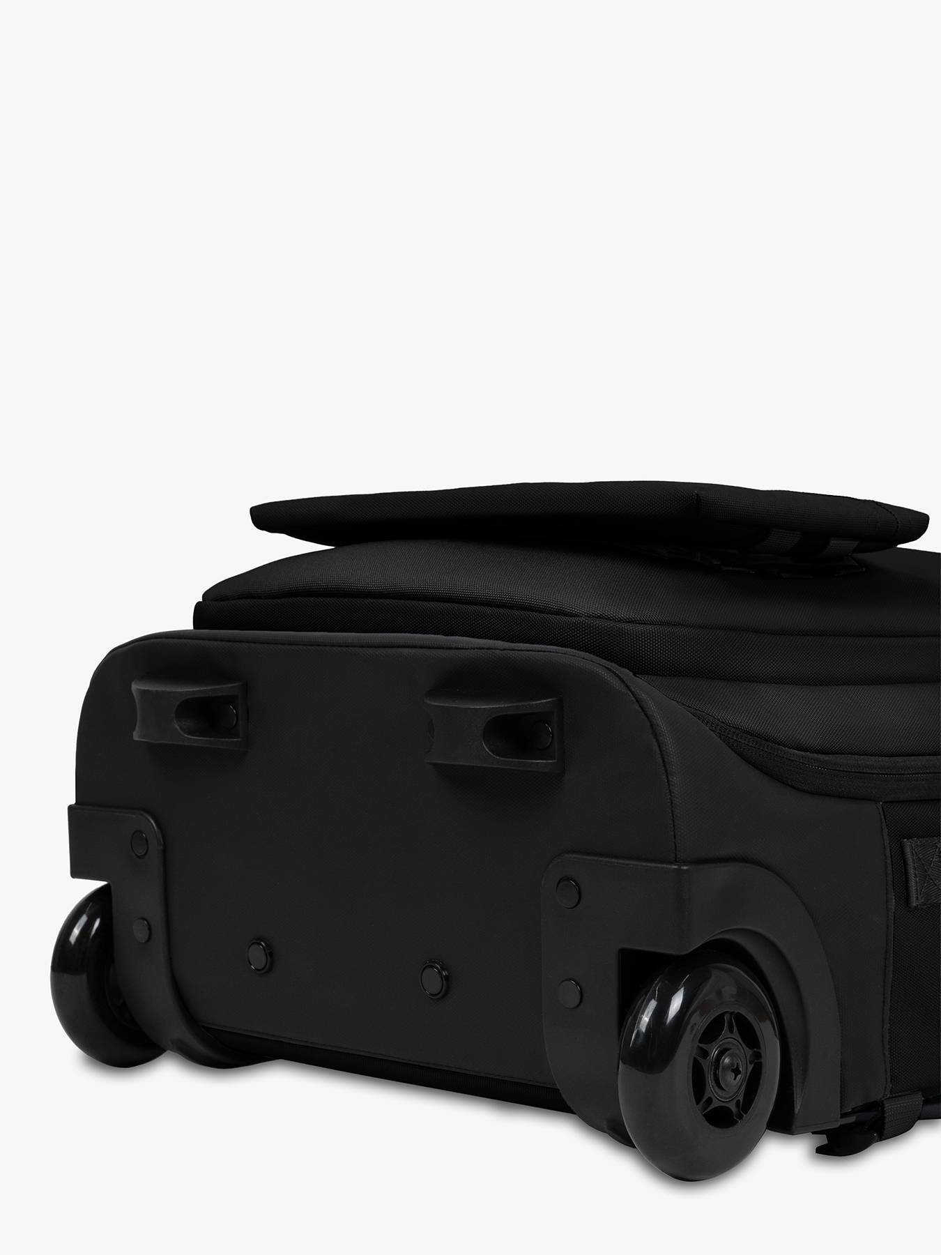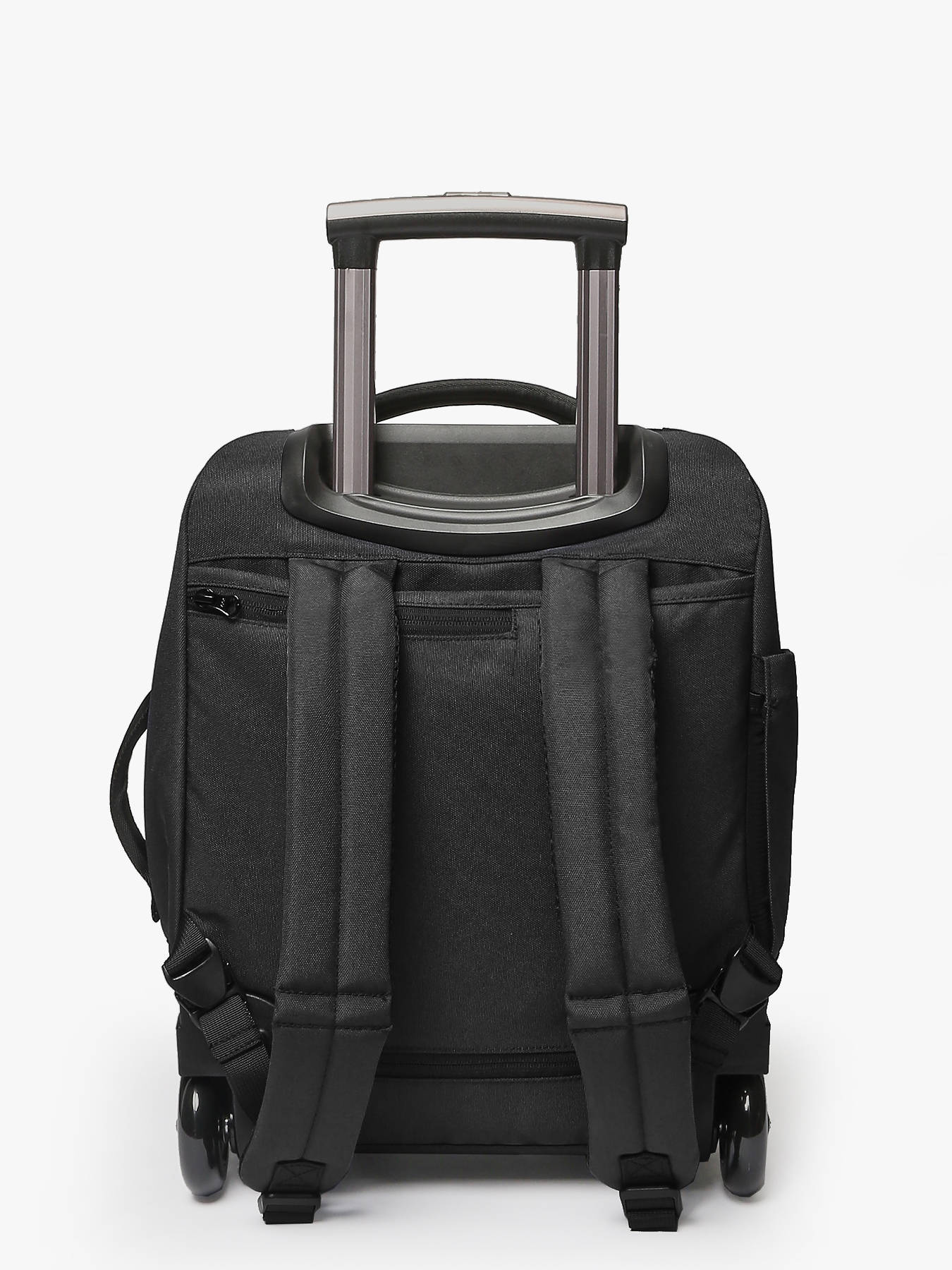 Equipped with integrated straps, it can be carried as a backpack. A convenient rain cover is included to protect the wheels and prevent dirt in backpack mode. It features a front-accessible laptop compartment (compatible with 14-inch laptops) and an exterior pocket for a water bottle.