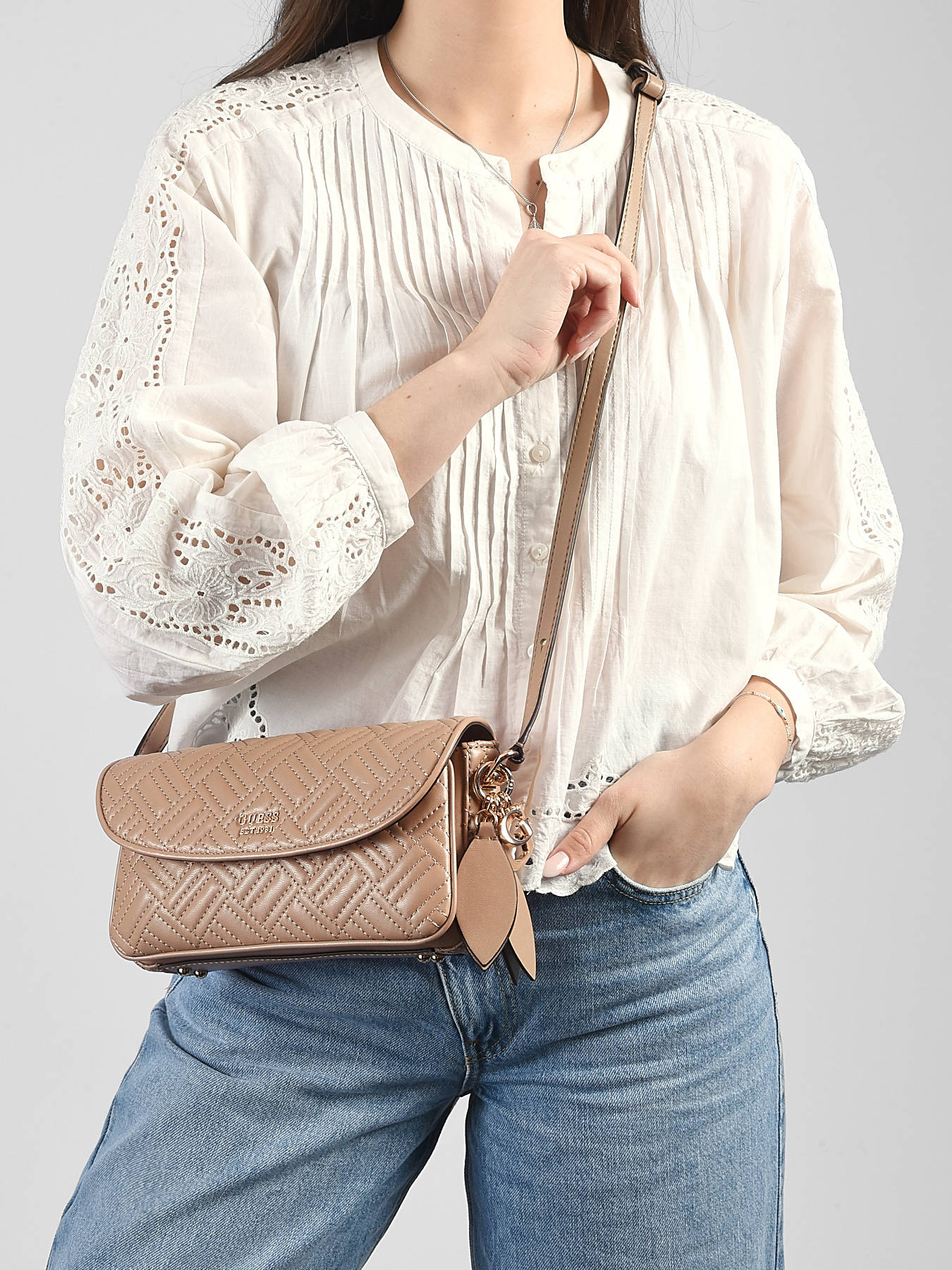 The SALLY GUESS crossbody bag in PU combines modern elegance with practicality. Its flap with magnetic closure keeps your belongings secure while providing quick access to essentials. Inside, two compartments, a zip pocket, and three card slots allow you to organize your personal items efficiently and stylishly. On the outside, a back pocket offers practical storage for must-have items. The adjustable strap allows it to be worn on the shoulder or crossbody, while the 31 cm handle height ensures optimal comfort. Compact and structured, this bag perfectly complements urban or sophisticated looks, adding a chic and contemporary touch to any outfit. Every detail, from the refined finishes to the quality PU material, reflects GUESS’s craftsmanship, making this bag a trendy, practical, and elegant accessory for everyday use.