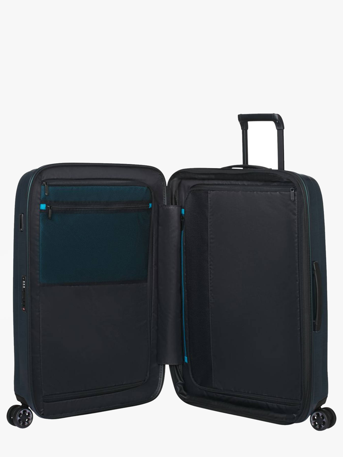Travel worry-free for a week with the SAMSONITE NEXIS hard-shell suitcase. Made from ROXKIN™ (polypropylene), this sturdy yet lightweight 3.2 kg suitcase offers an expandable capacity from 82 to 91 L and dimensions of 70 x 48 x 27 cm (expandable to 30 cm), ideal for carrying all your essentials comfortably. Its four 360° suspension wheels absorb shocks and reduce rolling noise for smooth and quiet mobility. The telescopic handle, top handle, and side handle provide comfortable handling in any situation. Secured with a TSA lock, it keeps your belongings safe during travel. Inside, two compartments and two zippered pockets allow efficient organization of clothes and accessories. Durable and stylish, this hard-shell suitcase comes with a 10-year warranty, combining strength, practicality, and contemporary design for both business and leisure trips.