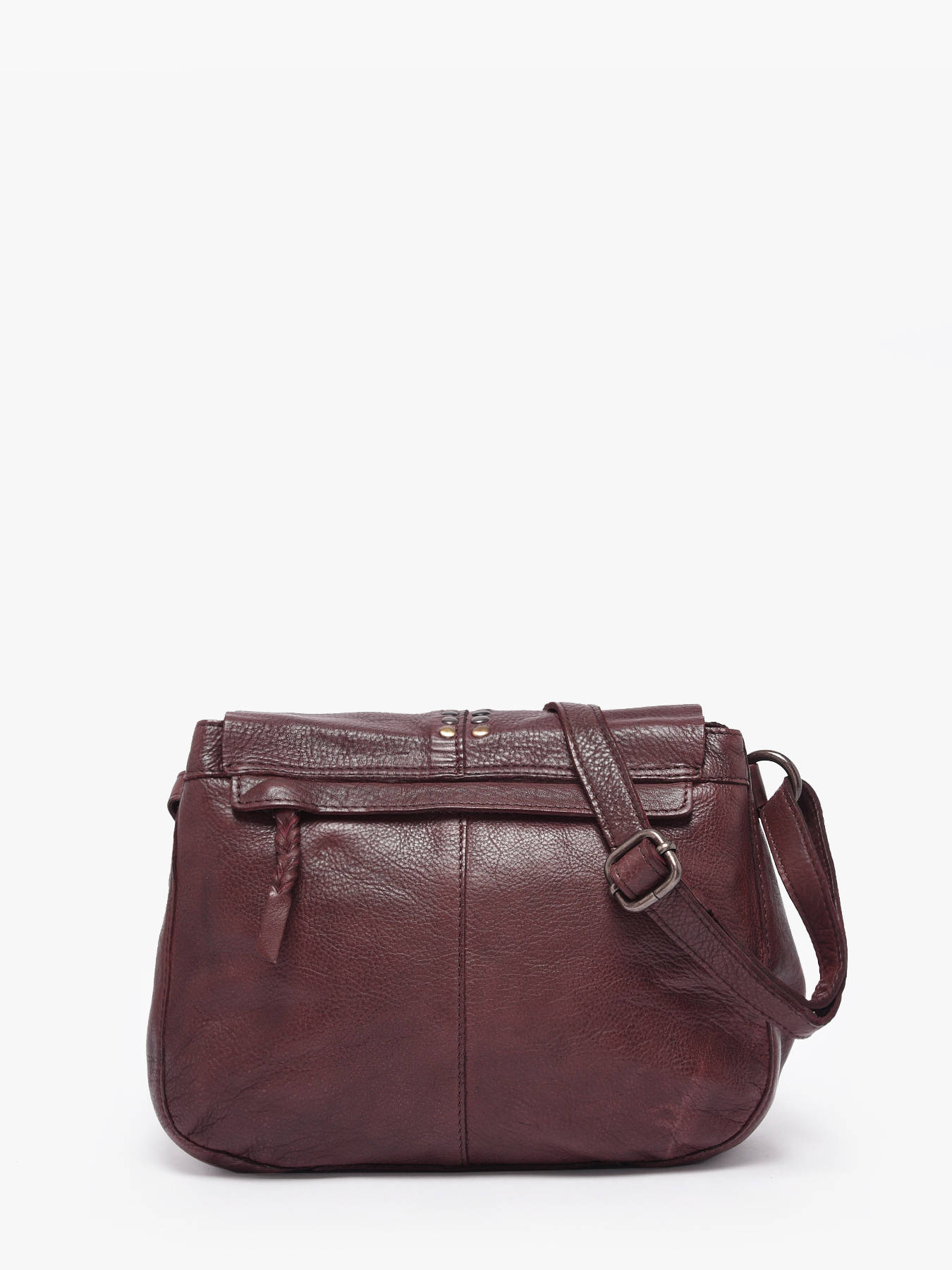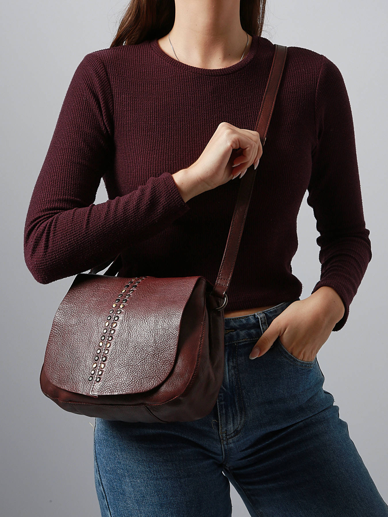 This women's handbag has been made in a nice quality cow skin leather. It is also decorated with small studs on the flap, which gives it a more modern style.