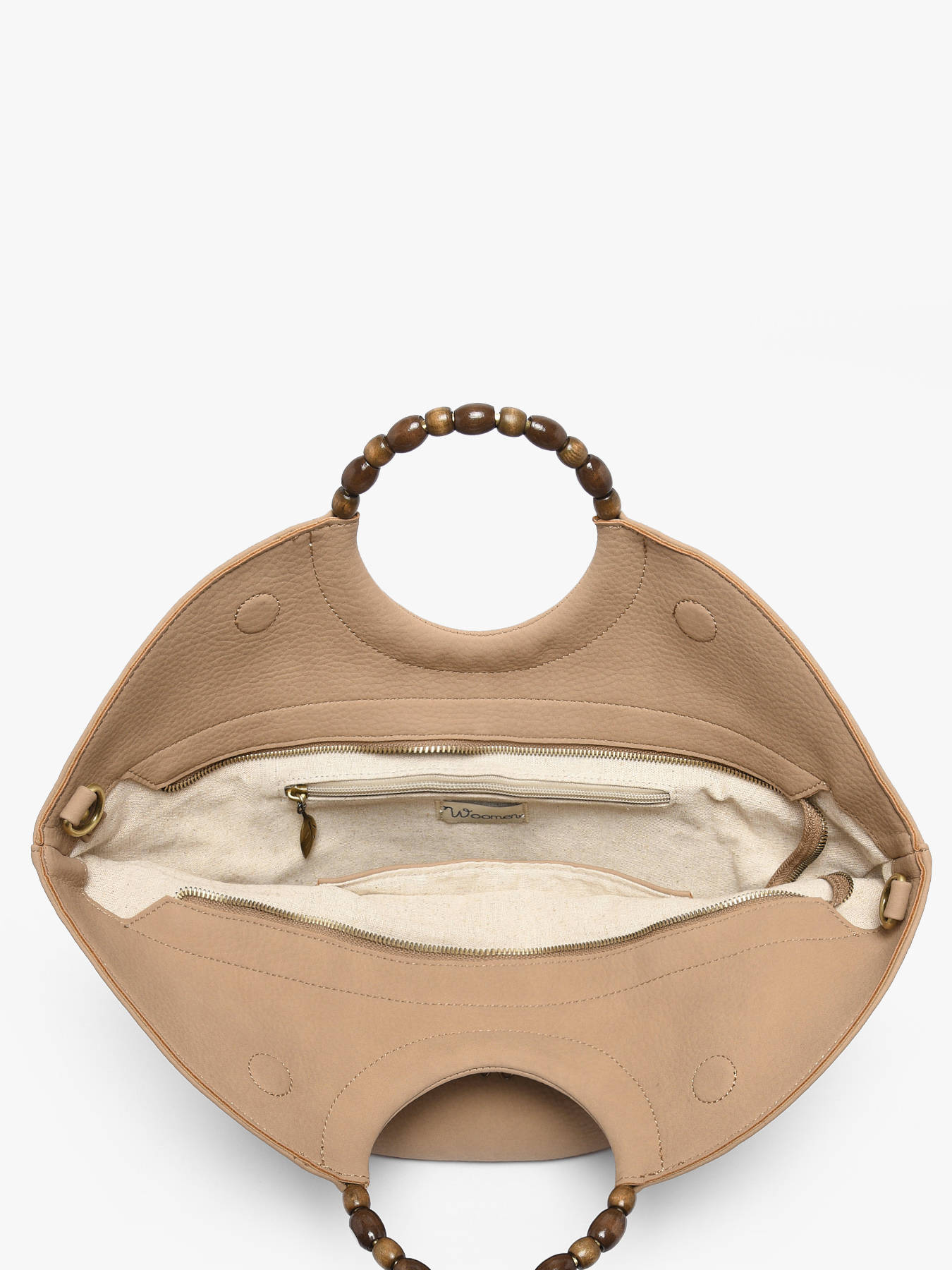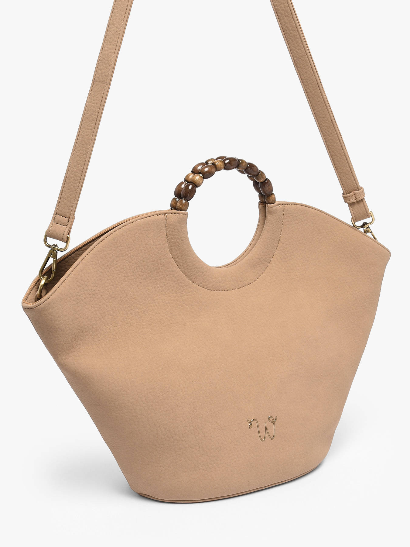 The large-format WOOMEN handbag from the Neflier Pearl line combines elegance, functionality, and sustainable design. Its main material, polyurethane composed of 58% recycled materials and lined with cotton and linen, ensures both lightness and durability. The wooden beaded handle and pearl-accented rings add originality and sophistication to the model. This bag features a zip closure, a zip pocket at the back, and a removable polyurethane strap for versatile wear, while inside, a zip pocket and a slip pocket help organize your essentials. The gold-tone resin logo completes the design with an elegant finishing touch, making this bag a practical and stylish accessory, perfect for complementing any outfit.