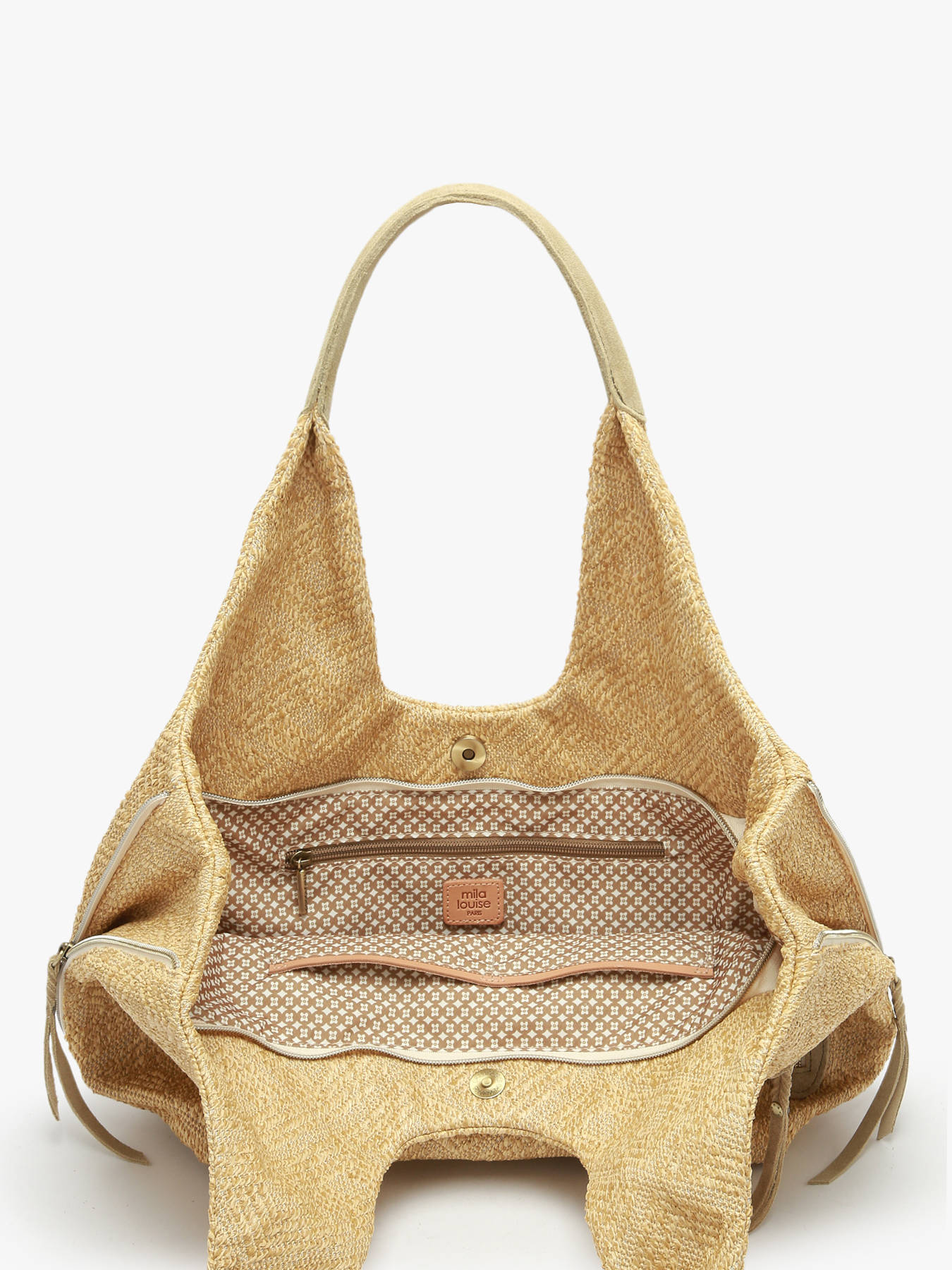 The CM2 MILA LOUISE shoulder bag, crafted from raffia with leather trim, combines natural elegance and modernity for everyday use. Its exterior features a front pocket and a combined zip and magnetic closure, providing easy and secure access to your belongings. With a 24 cm handle, it offers comfortable shoulder wear, perfect for urban commutes or outings. Inside, one slip pocket and one zip pocket allow efficient organization of essentials such as your phone, wallet, and small accessories. Lightweight and refined, this CM2 MILA LOUISE bag stands out with its elegant design and natural materials, adding a sophisticated touch to any outfit. Perfect for combining style, comfort, and practicality, it is a must-have accessory for those seeking a chic and functional bag.