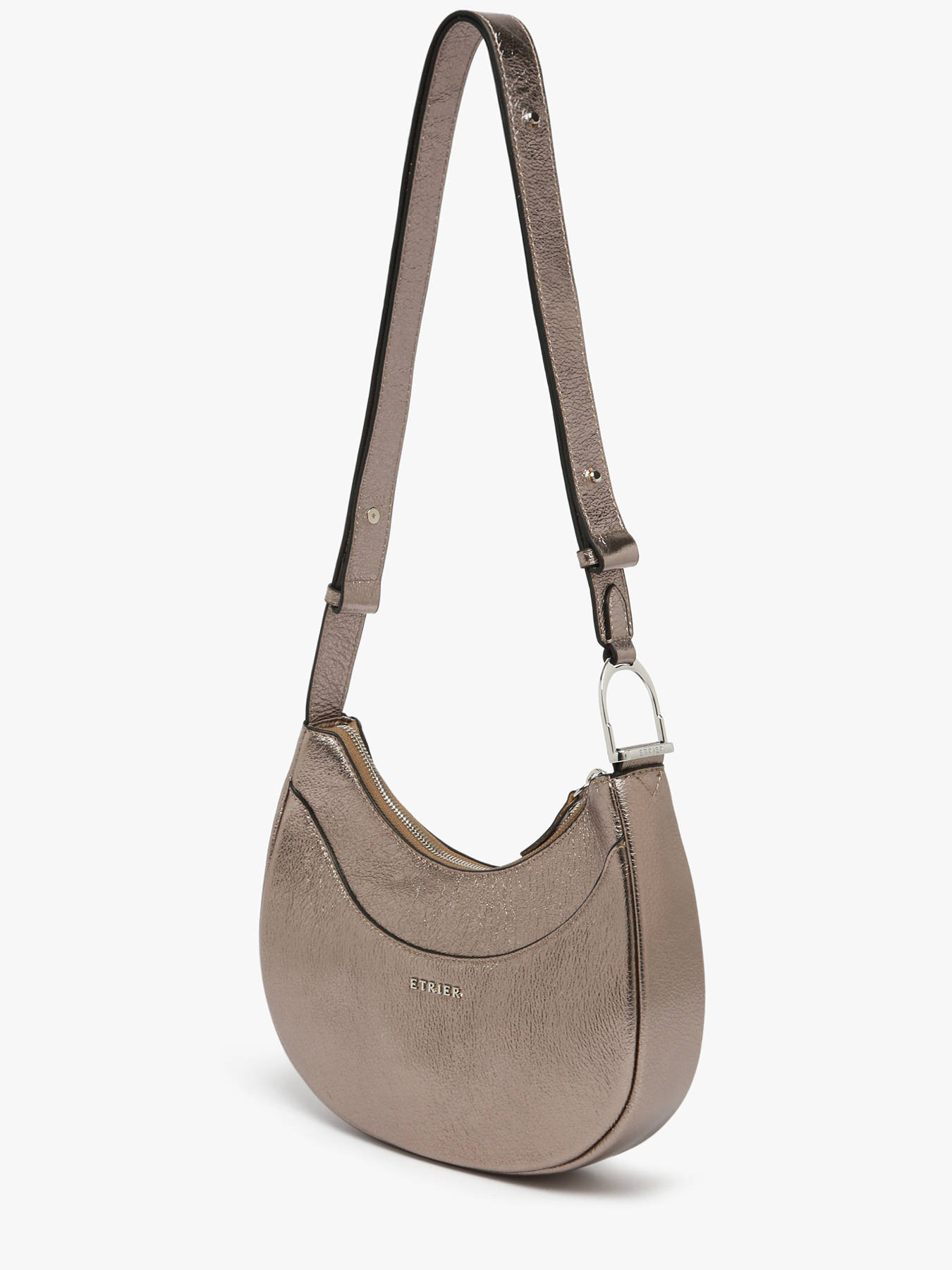 The ETRIER shoulder bag from the JOLLY line is crafted from iridescent cowhide leather, bringing a luminous elegance to this bold style. Its zipped closure ensures the security of your belongings, while the back exterior pocket offers quick and practical access to essentials. The adjustable strap provides comfortable shoulder wear, perfect for everyday use. Inside, the main compartment is complemented by a simple pocket and a zipped pocket, making organization easy. The Jolly line draws inspiration from the “Highlander Cowboy” spirit, blending wild allure with modern refinement. The Etrier logo detail on the strap adds a final elegant and distinctive touch to this bag, ideal for showcasing a unique style during winter.
