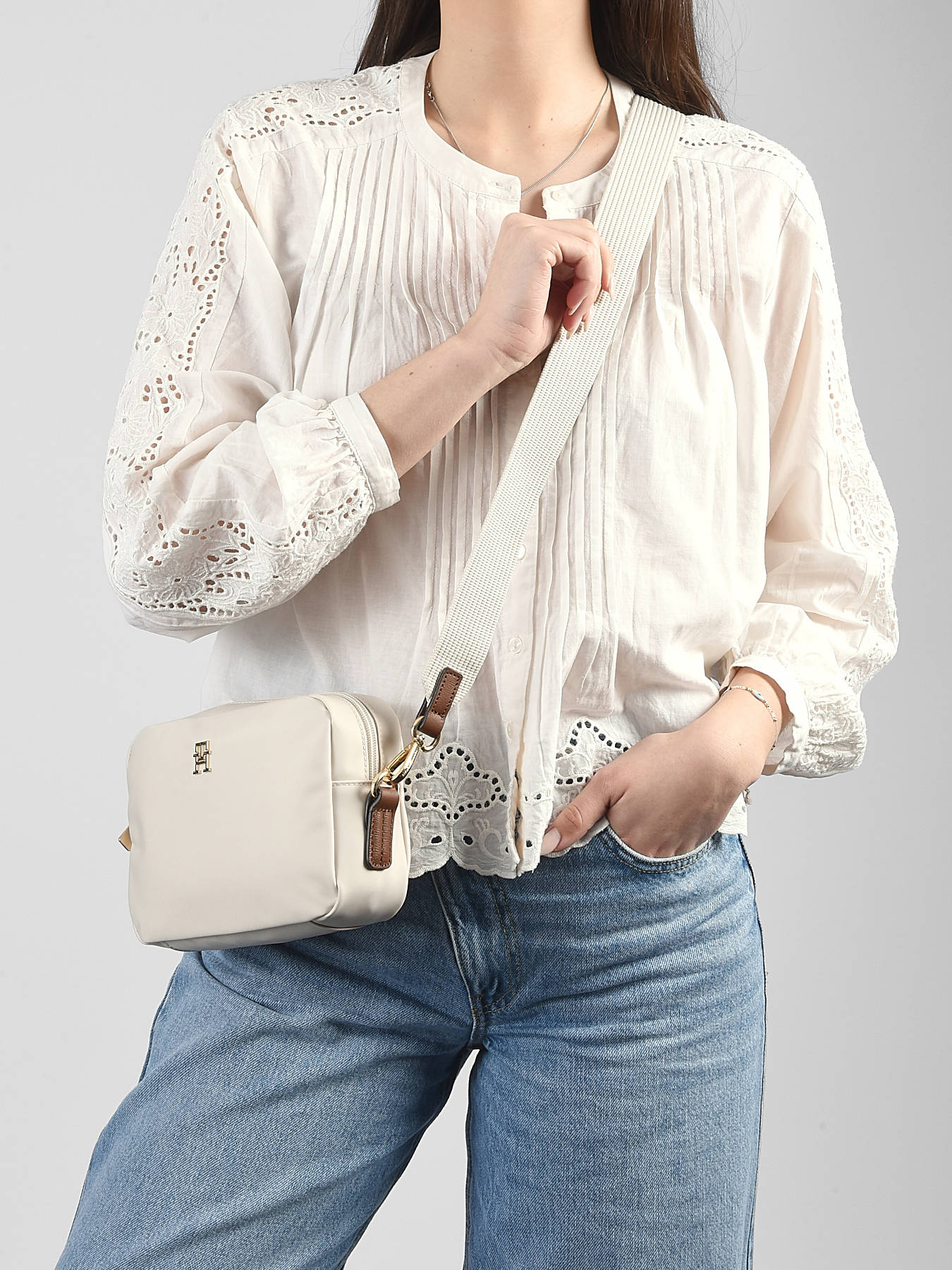 The POPETTE TOMMY HILFIGER crossbody bag in nylon with leather trim combines modern style with everyday functionality. Its zip closure keeps your belongings secure while allowing quick access to your essentials. Inside, one main compartment and a zip pocket provide organized and practical storage for your items. Compact and lightweight, this bag is comfortably worn crossbody with its adjustable strap, ensuring optimal comfort throughout the day. Its clean and contemporary design adds a chic and casual touch to any outfit, perfect for urban, professional, or casual use. The quality materials and refined finishes reflect TOMMY HILFIGER craftsmanship, making this bag a durable, practical, and stylish accessory. Versatile and trendy, it accompanies your day with elegance and simplicity, perfectly blending aesthetics and practicality.