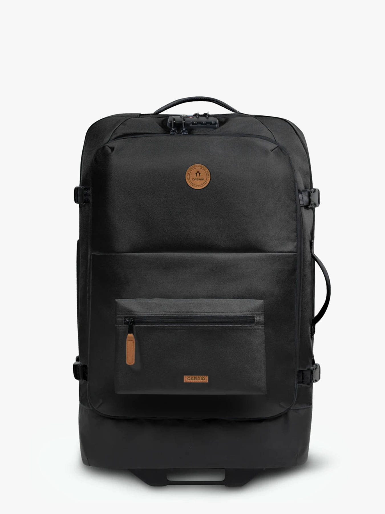 Travel smarter with the Cabaia 2-wheel soft-shell suitcase, built for organized adventurers. Crafted from recycled, vegan, water-repellent materials, it offers both durability and sustainable design. With a generous 75 L capacity, it's ideal for extended trips. Smooth handling is guaranteed thanks to its replaceable wheels, telescopic handle, and side/top carry handles. For added protection, an integrated TSA lock keeps your belongings safe. The exterior features a quick-access front opening, a water bottle pocket, and a MOLLE system to attach modular pouches. A large zipped front pocket adds even more functionality. Inside, you'll find a double compartment layout with compression straps and a laptop sleeve suitable for all sizes. Practical, versatile, and thoughtfully designed, this suitcase is ready to follow you wherever you go—with both comfort and modern style.