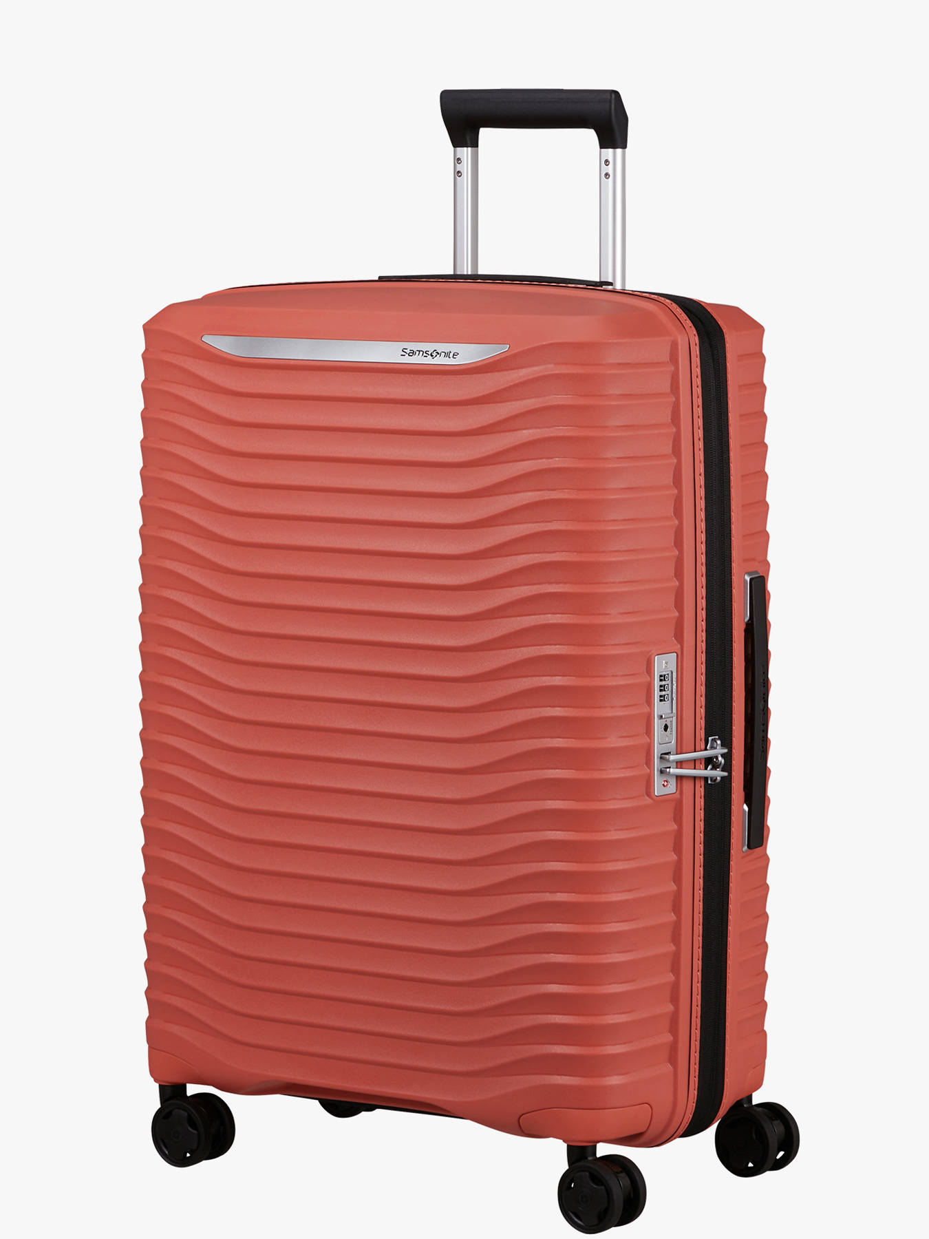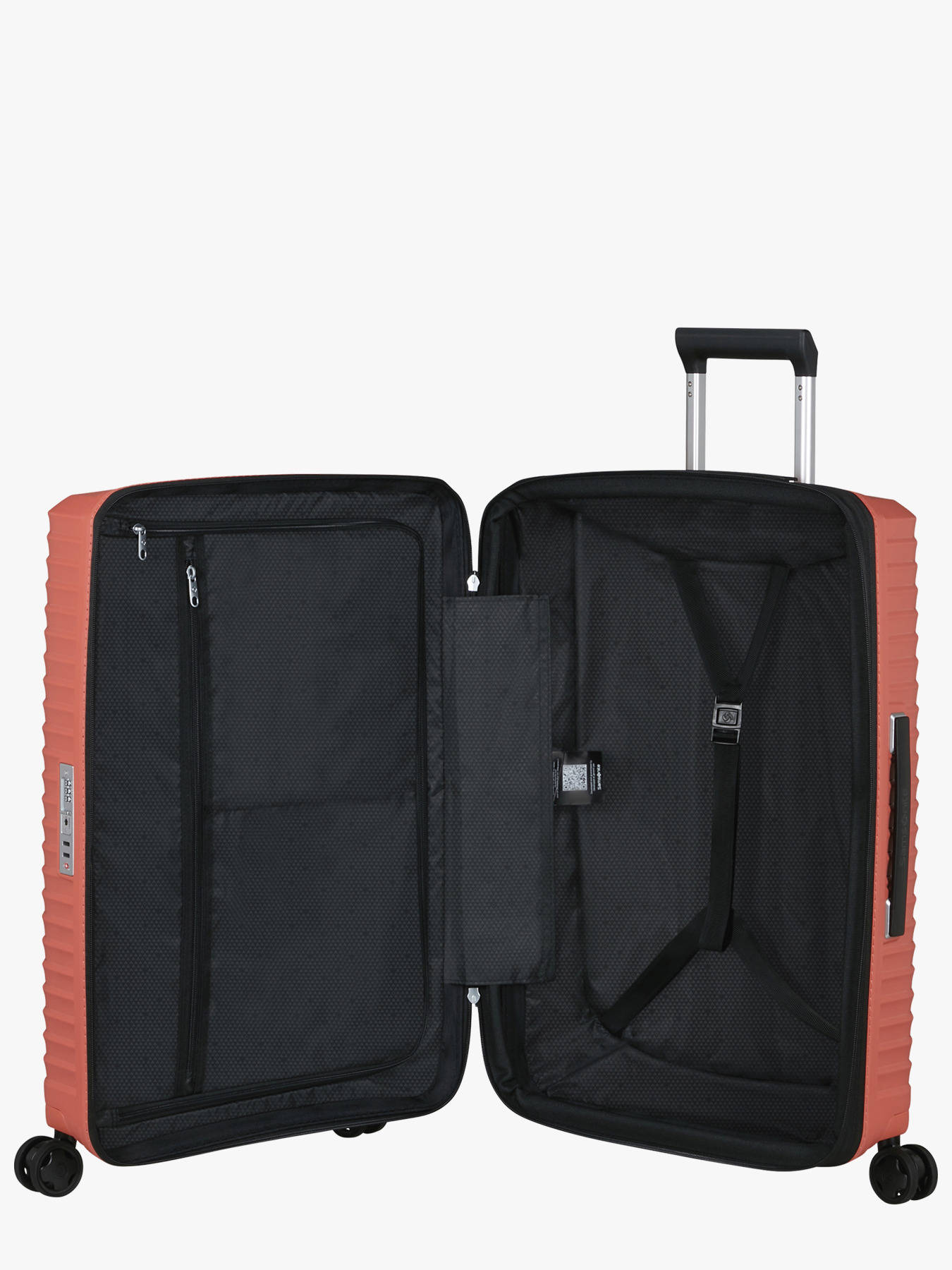 Choose comfort with Upscape. Travel carefree with its lightweight, shock-absorbing suspension wheels and removable, washable inner lining. The ultra-convenient stretch and silver lining will only add to the fun of your travels. With 4 shock-absorbing, noise-reducing suspension wheels, a TSA combination lock for added security and a double-tube telescopic handle, the Samsonite Uspcape will follow you wherever you go. The interior is made from recycled polyester and features two compartments with either a strap or zip closure to keep everything in place during transport.